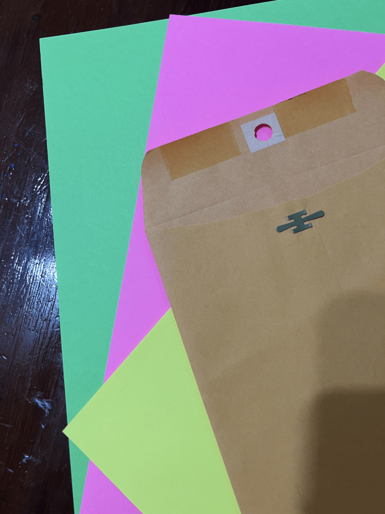 A manila envelope filled with three jagged squares of neon posterboard, cut hastily and uneven.